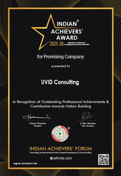 Guided by its philosophy, “Built on Trust. Powered by Insight.”, UVID Consulting continues to shape the future of finance by helping organizations unlock clarity from complexity and drive sustainable growth. At the Indian Achievers’ Forum, we proudly recognize UVID Consulting, under the leadership of Ramya Krishnaganth, as the recipient of the Indian Achievers’ Award for Promising Company, celebrating its vision, impact, and growing global influence in financial transformation.